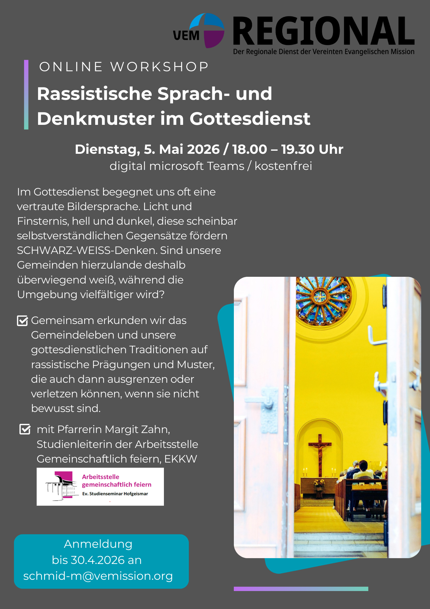 Information und Anmeldung über: Pfr. Helmut Müller; Regionaler Dienst der VEM, Region Köln/Bonn: mueller-h@vemission.org