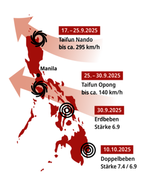 Bereits Anfang Oktober traf ein Erbeben der Stärke 6,9 die Insel Cebu. Kurz zuvor zogen die Supertaifune Nando und Opong über das Land.