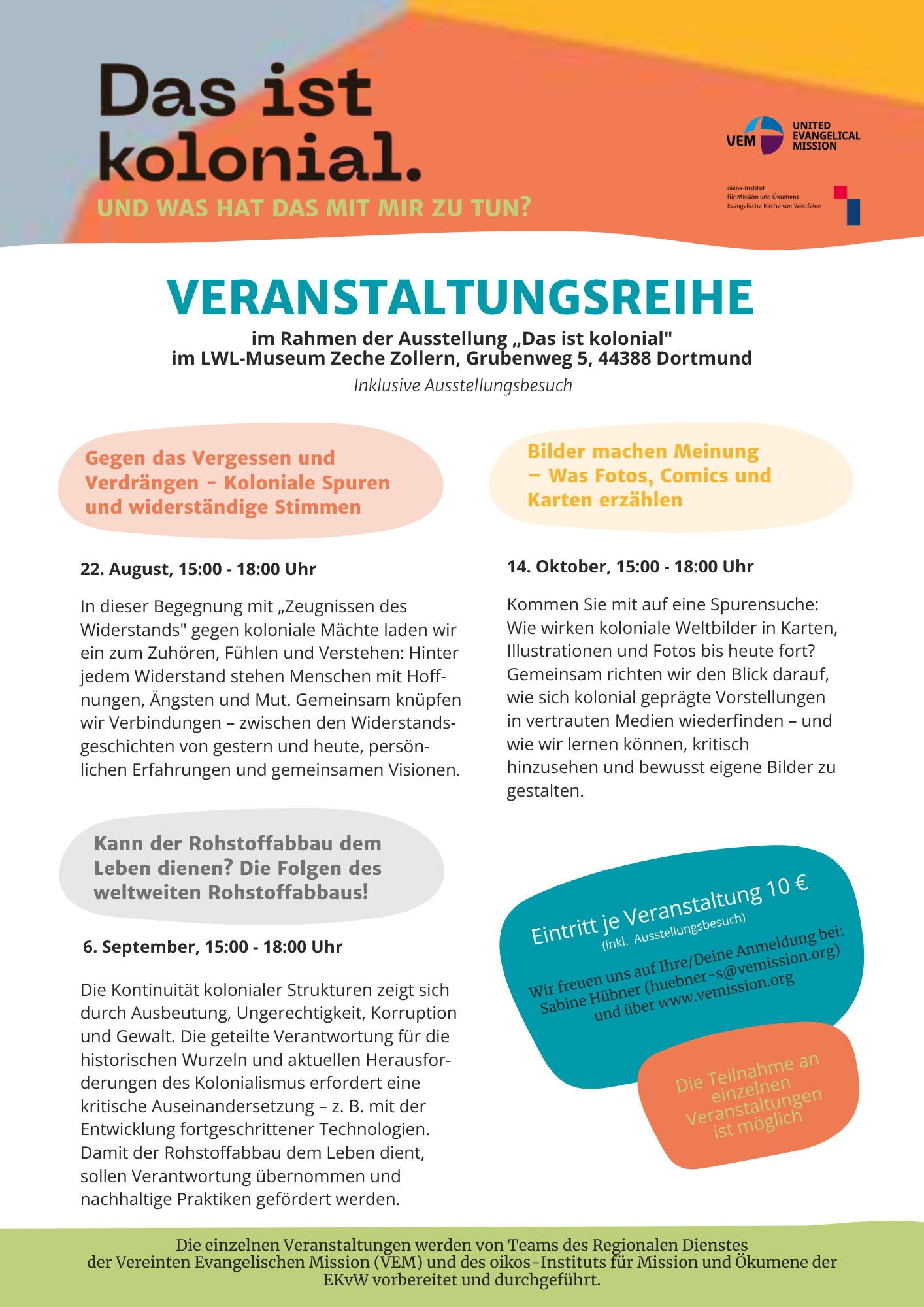 Die Veranstaltungen werden von der Vereinten Evangelischen Mission (VEM) und dem oikos-Institut für Mission und Ökumene der EKvW organisiert. Die Teilnahme an einzelnen Veranstaltungen ist möglich.